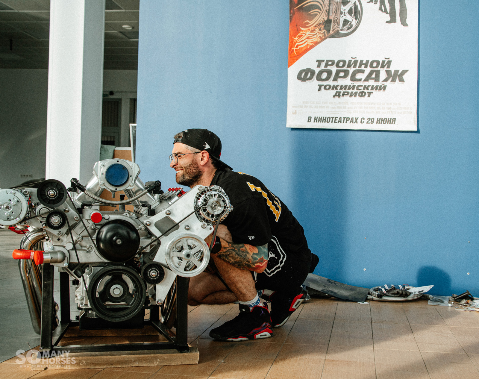 У Кена Блока был Mustang 1965 года, а у нас совершенно точно есть по крайней мере приборная панель от Mustang того же года. (Смеётся.) А ещё шильдик. Ну и зеркала от автомобиля 1966 года выпуска. Плюс свежесобранный мотор от Chevrolet, подвеска от Nissan Silvia, подвеска от BMW E92 и так далее. Но, опять же, для нас самое главное — идеология автомобиля. Машина должна делать шоу: «орать», стрелять огнём, жечь резину, гонять в джимхане, в дрифте и выдавать красивую картинку. Для меня важно, что на мероприятии на неё посмотрят дети и подростки. Они не будут думать о том, какой двигатель под капотом, их будут переполнять эмоции восторга, радости. И это одна из наших миссий: чтобы подрастающее поколение интересовалось этим, а не всякими сомнительными занятиями и вредными привычками. Когда-то я увидел этот автомобиль, и он помог мне встать на правильный путь. Надеюсь, что так же будет с теми, кто познакомится с нашим проектом.