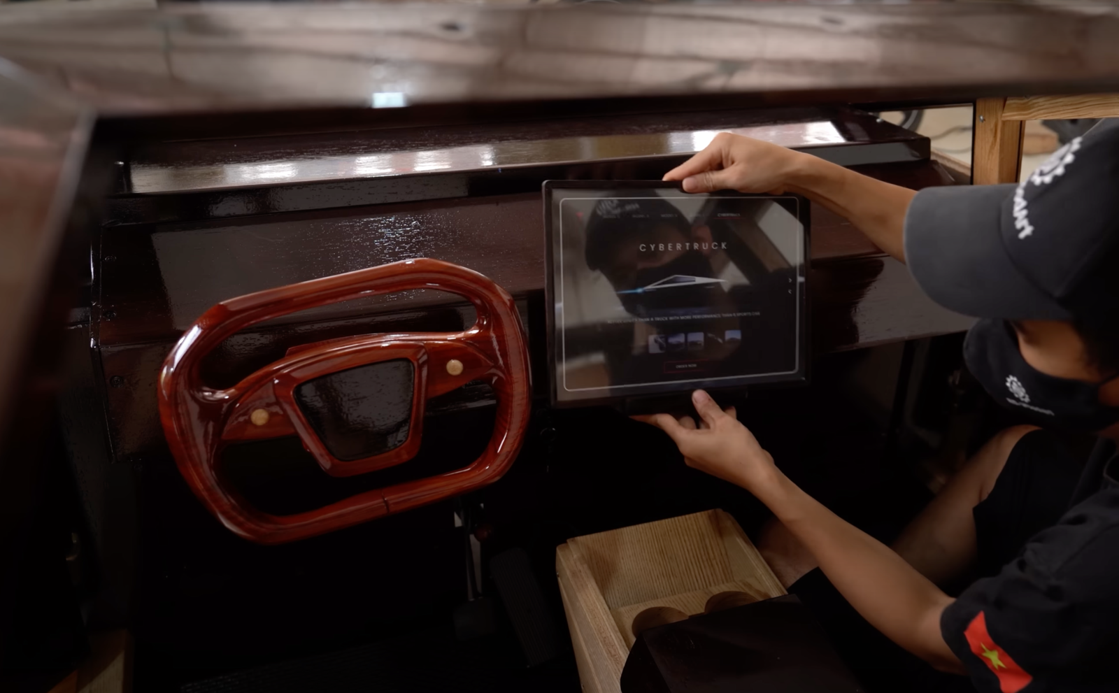 В основу модели легла стальная рама, а всё остальное сделано из дерева: кузовные панели, руль, колёсные диски и даже сиденья. Стёкла машины выполнены из пластиковых листов, а сзади имеется багажник. Немаловажно ещё и то, что этот Cybertruck полностью рабочий и на нём можно ездить.