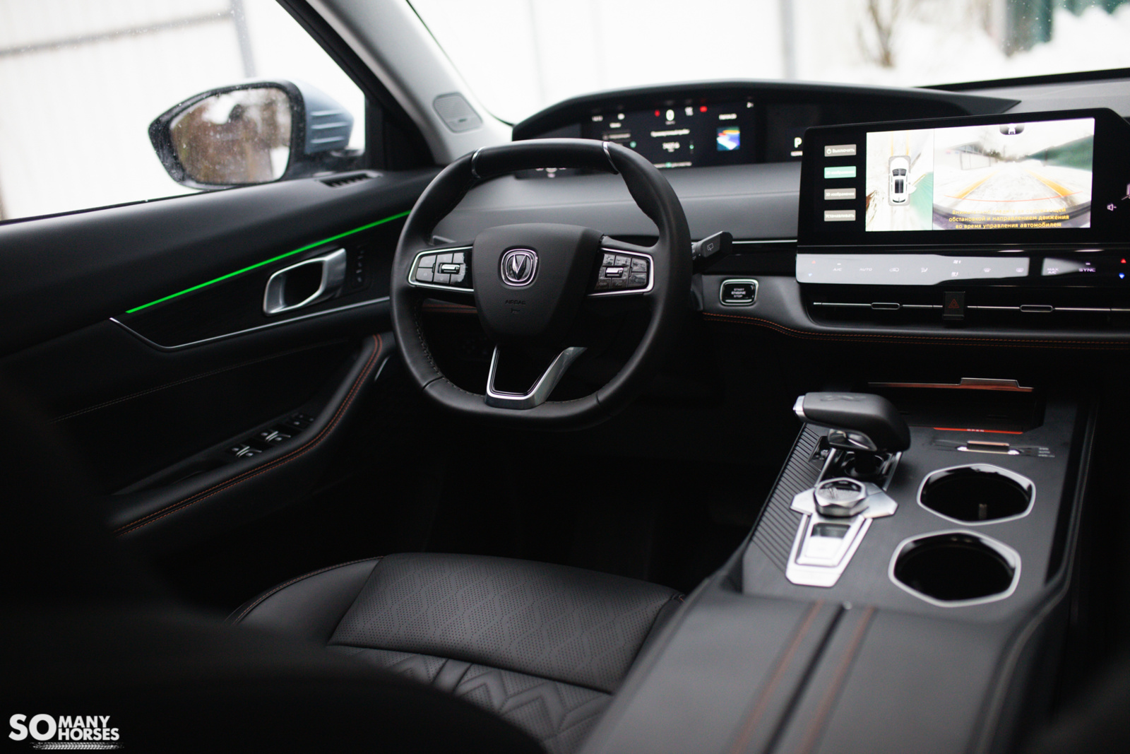 Салон автомобиля в соответствии с современными традициями китайских автомобилей встречает нас обилием экранов. Не буду отрицать, сперва это пугает, и ты даже впадаешь в лёгкий ступор, но когда разберёшься, как их настроить, начинаешь наслаждаться обстановкой. Чуть позже я расскажу вам обо всём этом экранном многообразии, а пока не без сожаления отмечу, что проекционный дисплей нам почему-то «не положили».
