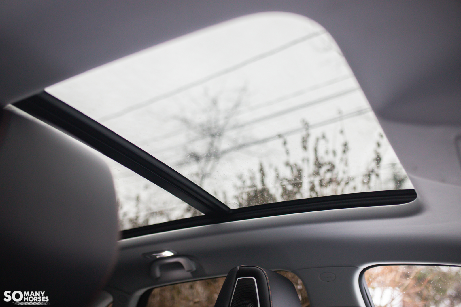 Перед тем как отправиться на задний диван, посмотрим на панорамную крышу, которая занимает весь доступный объём потолка и доходит практически до задних подголовников. Поднимается, конечно, только её передняя часть, но, коснувшись кнопки открытия, можно активировать режим проветривания. И да, если вы забыли про люк и ушли домой, а надвигается дождь, автомобиль сделает всю работу за вас, задвинув крышу самостоятельно.
