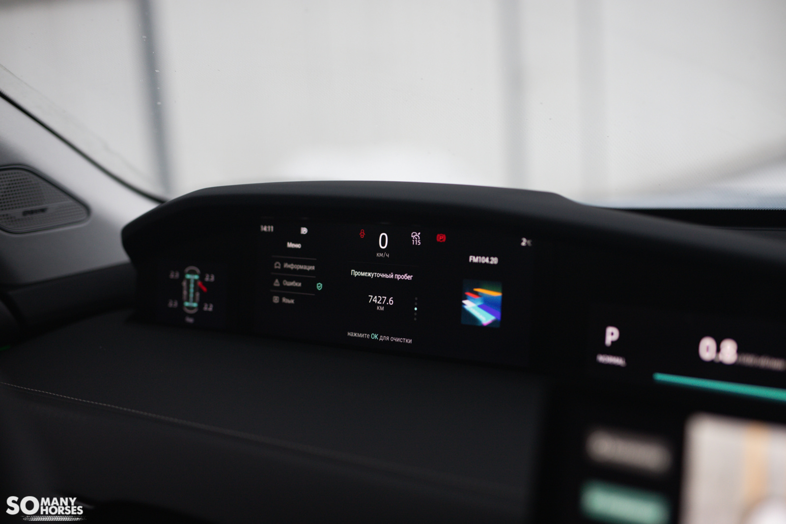 Разбираться с электронной составляющей начнём с приборной панели, состоящей из трёх дисплеев. Самый первый, который бросается в глаза сразу, как только садишься в салон, постоянно информирует нас о том, что в шинах присутствует давление, и заменить эту картинку ничем нельзя. Наверное, для производителя по каким-то особым причинам эти данные очень важны, но лично для меня они совершенно бесполезны. Спасибо.
