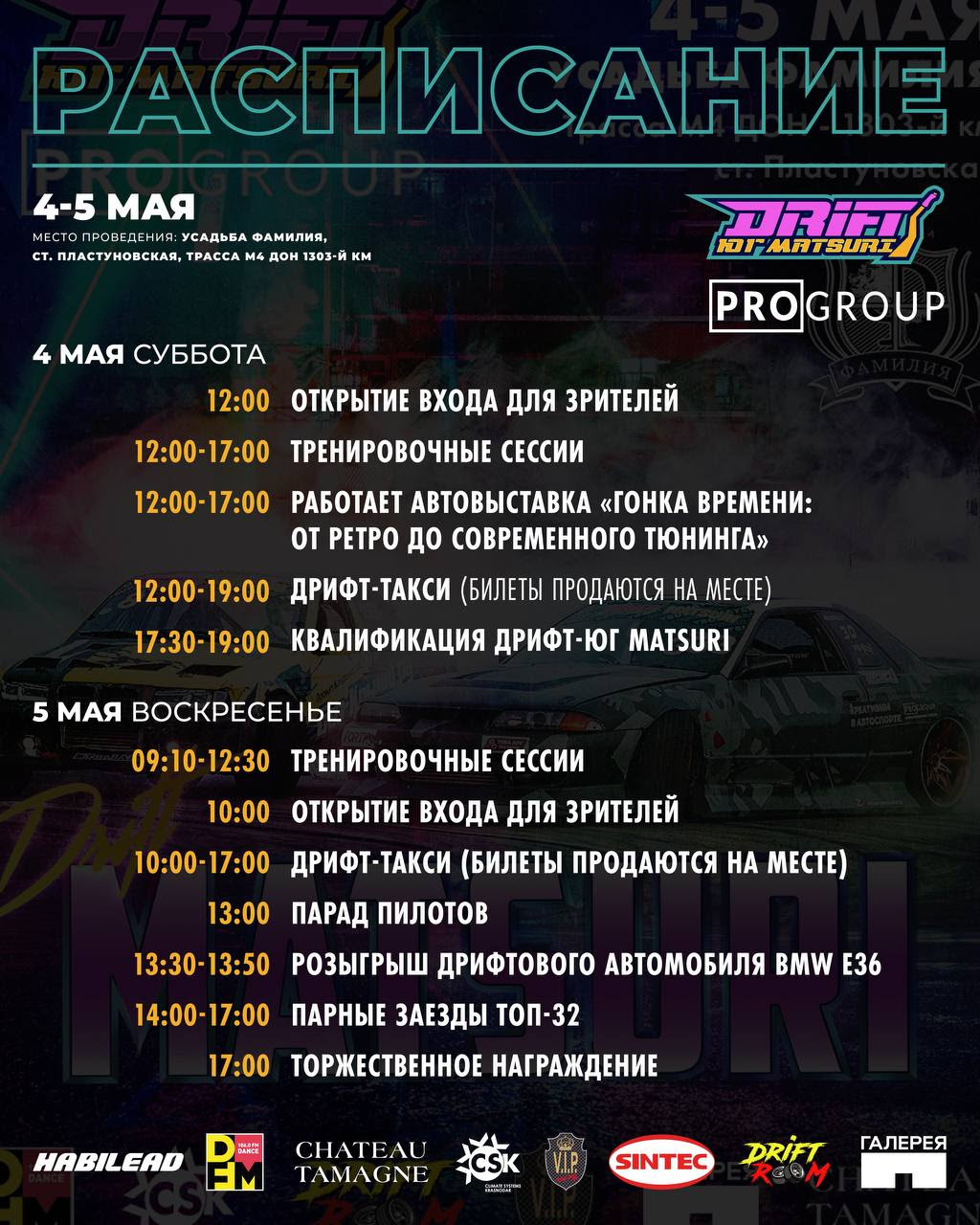 Тем же вечером в лучах закатного солнца стартует соревновательная программа второго этапа фестиваля Дрифт-Юг Matsuri. После пятичасовых тренировок и настроек автомобиля полсотни лучших дрифтеров со всей России проедут квалификацию, которая определит порядок парных выступлений в воскресенье, 5 мая.