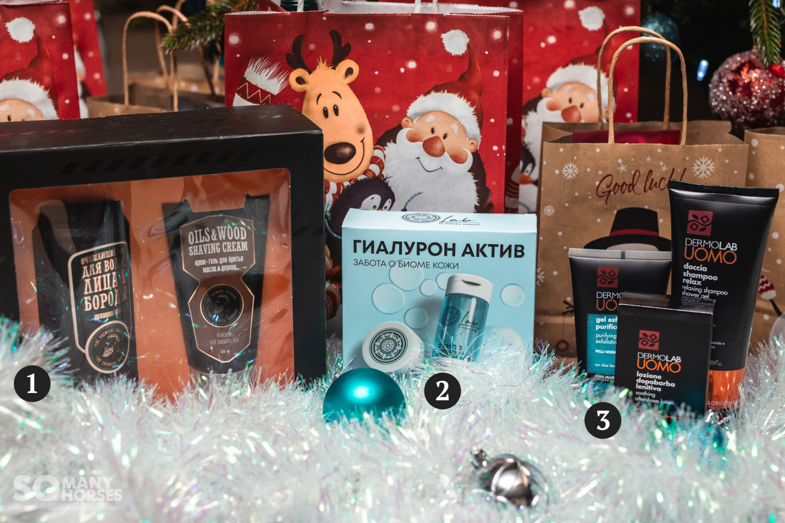 Ну а для тех, кто совсем не хочет заморачиваться, всегда есть замечательный вариант в виде косметического набора. Нам приглянулись сразу три. Мужской набор от российского бренда The Chemical Barbers (1), в который входит очищающий гель для волос, лица и бороды, а также крем-гель для бритья. Мини-набор от Natura Siberica (2), который, к слову, подойдёт и для девушек, и для мужчин благодаря своему универсальному составу — увлажняющие патчи для глаз и мицеллярная вода. И классный подарок для мужчины от марки DermoLab Uomo (3) — расслабляющий шампунь-гель для душа, отшелушивающий гель-скраб для лица и успокаивающий лосьон после бритья.