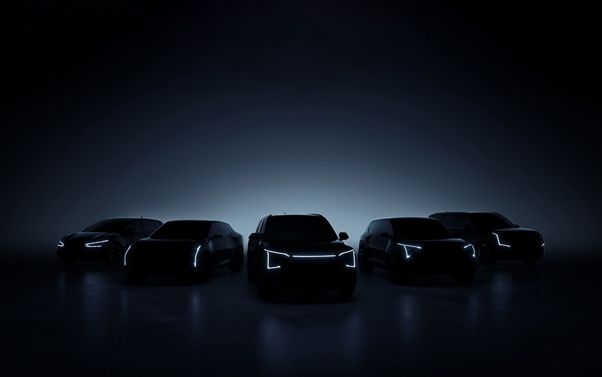 Что касается неизвестных новинок, то пока Kia опубликовала первое тизерное изображение, на котором запечатлены пять различных моделей разных классов. Все они затемнены: хорошо просматриваются только силуэты кузовов и включённая передняя оптика. При этом три из показанных машин нам уже знакомы: это EV5, EV6 и EV9. А два авто, расположенные между ними, ранее не демонстрировались.