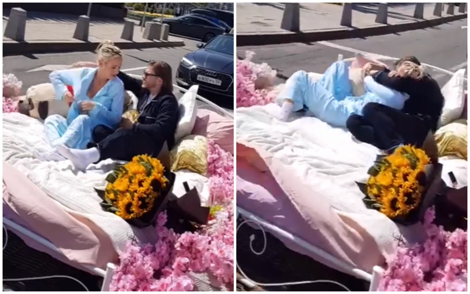 На кадрах видно, как Кока с незнакомым молодым человеком едет в обнимку на огромной кровати, прицепленной к автомобилю. Пару окружают множество подушек, букеты цветов и мягкие игрушки. Певица одета в небесно-голубую шёлковую пижаму, а её «попутчик» — в такую же, но чёрную. Однако в чём именно заключалась идея такого перформанса, артистка не рассказала.