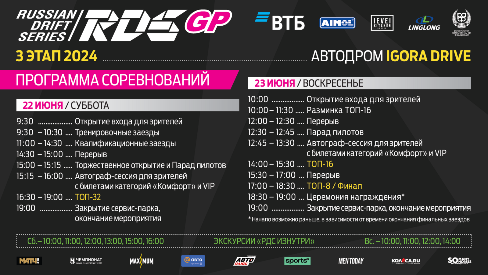Следить за событиями на трассе можно будет с трибун автодрома «Игора Драйв» и в прямом эфире на платформе RDS TV: квалификационные заезды станут доступны для просмотра бесплатно после быстрой регистрации, а парные заезды — по подписке.