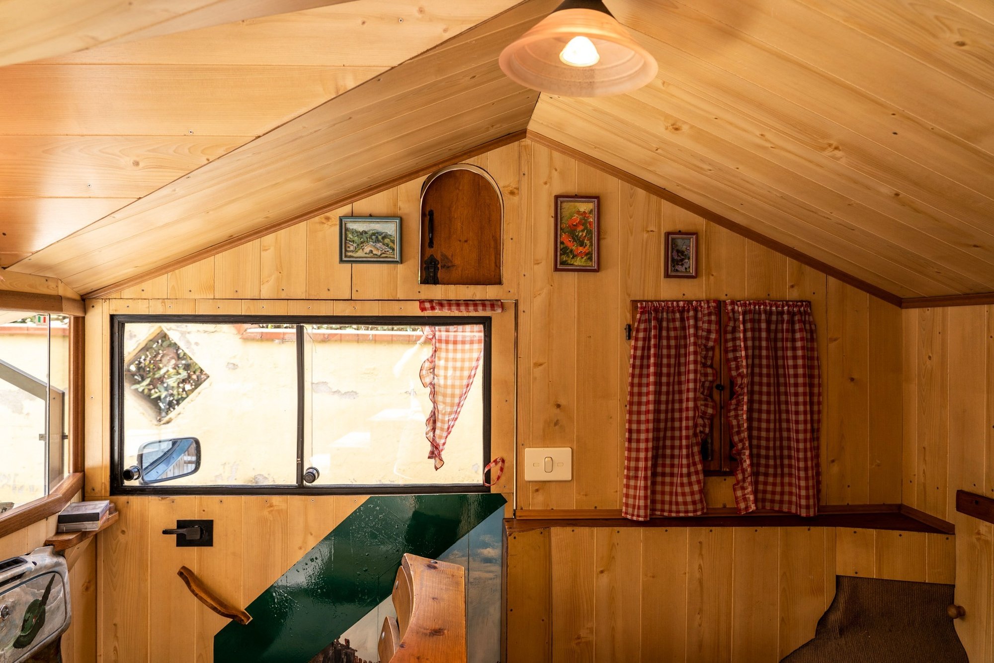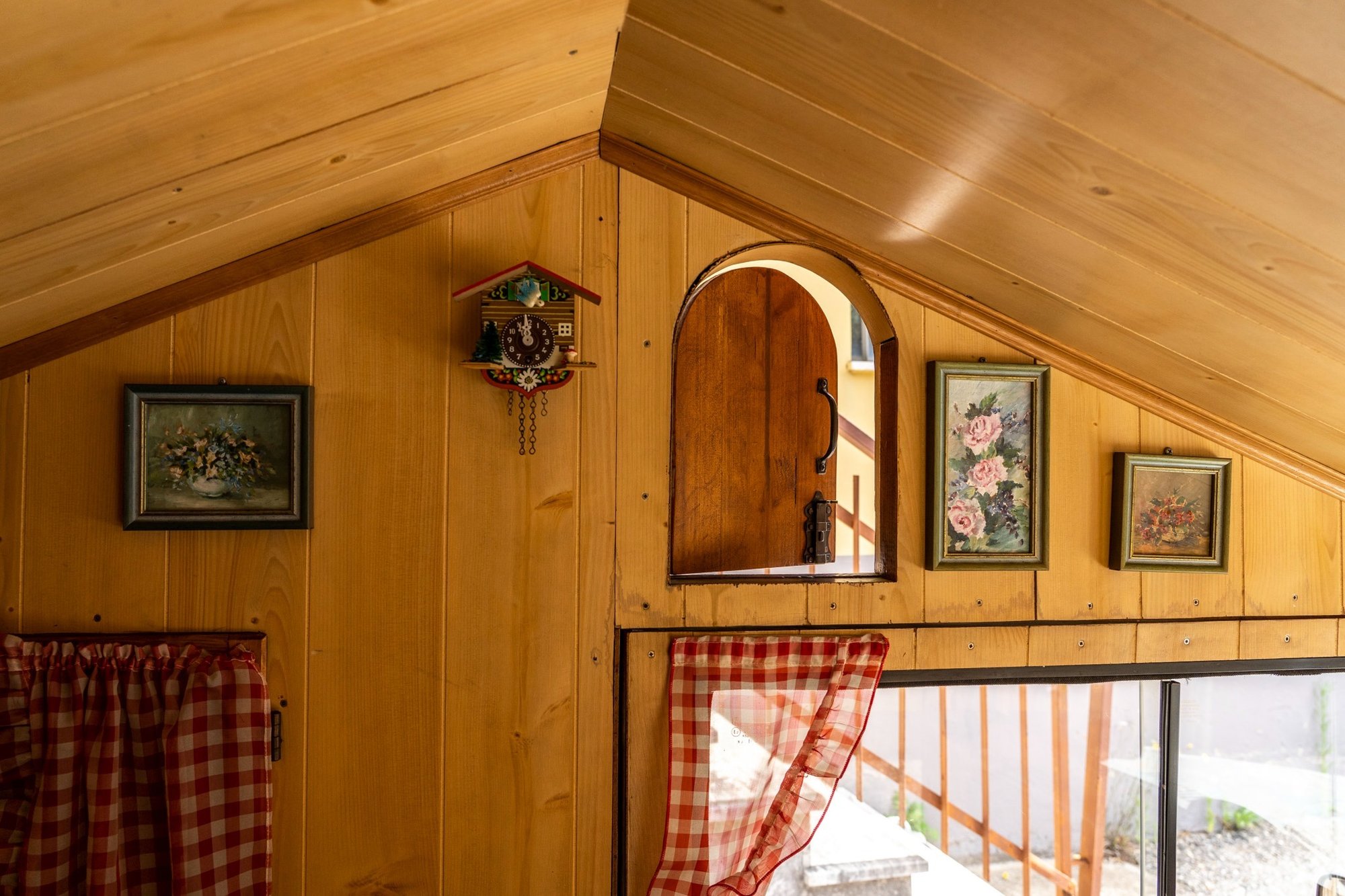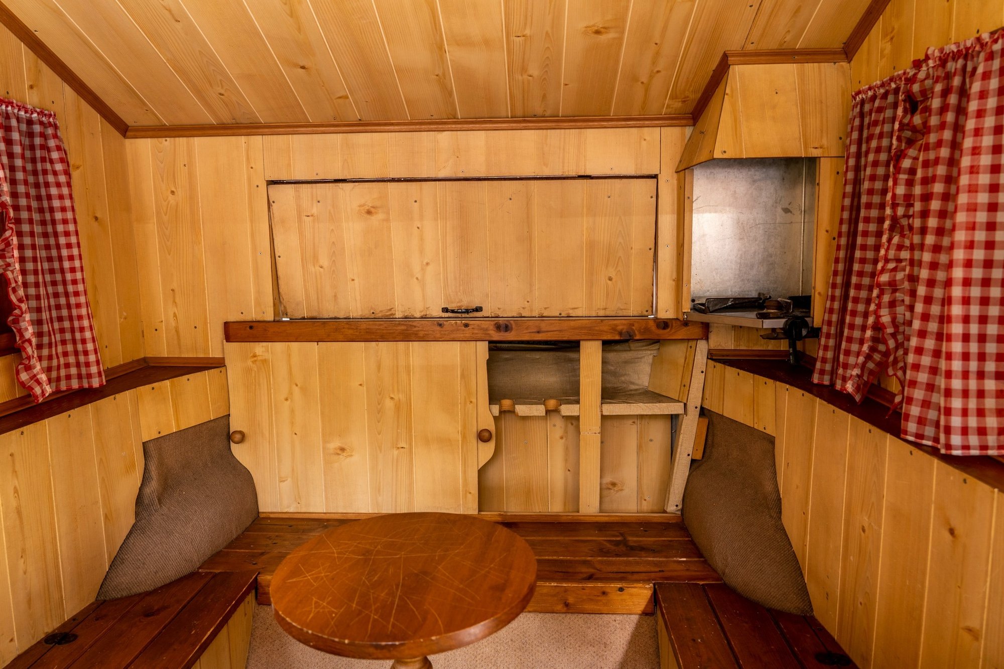 Интерьер Holzhaus также сделан в стиле деревенской хижины. Внутри расположены диван, обеденный стол, мини-кухня с газовой плитой и клетчатые занавески на окнах. Стены украшены картинами и часами с кукушкой. При этом оригинальный руль автомобиля был заменён деревянным колесом, а вместо рычага коробки передач использована перевёрнутая ножка стола.
