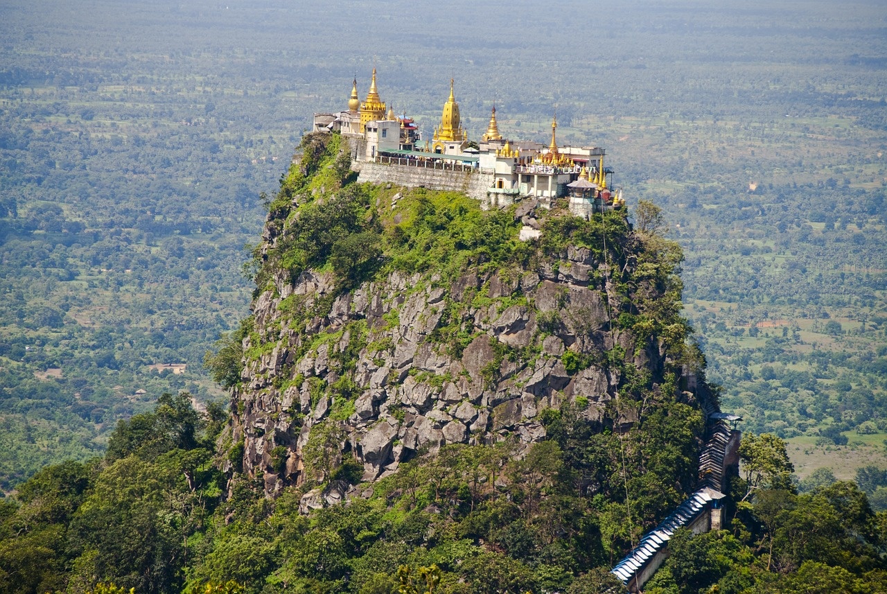 На одной из скал находится священный монастырь Таунг Калат, считающийся домом для 37 бирманских натов (духов). Но имейте в виду: к монастырю ведут 777 ступеней и подниматься вам придётся пешком. Так что людям, имеющим проблемы со здоровьем и другие противопоказания, а также беременным женщинам стоит отложить прогулку до лучших времен. Однако преодолев этот не очень-то лёгкий маршрут, вы сможете насладиться умопомрачительной панорамой.