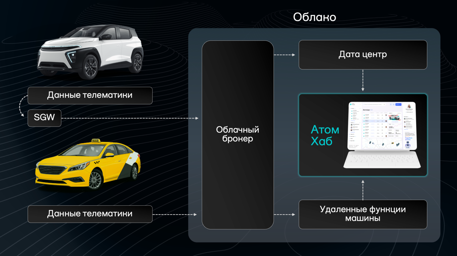«“Атом Хаб” разработан как для владельцев бизнеса, так и для частных лиц, обеспечивая удобное управление автопарком с помощью телематических устройств, повышающих операционную эффективность. Облачная система может быть интегрирована в любые автомобили при условии подключения дополнительного телематического оборудования».