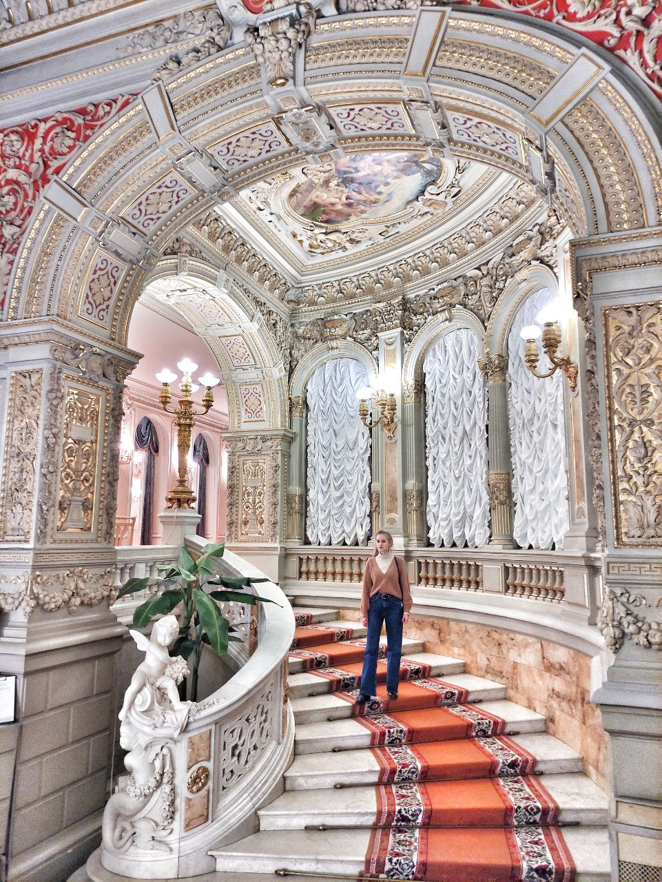 Следующая остановка — Академия Хогвартс! Ой, Штиглица! Да, это не дворец, а действующий вуз, но определенно стоит узнать его историю и полюбоваться интерьерами: вот где надо было снимать фильмы про Гарри Поттера! Каждое помещение посвящено тому или иному стилю в искусстве — в качестве наглядного пособия студентам, которые учатся в академии на художников, архитекторов, скульпторов. Кстати, в разные времена и сами ученики принимали участие в оформлении залов. А как-то студентов попросили восстановить забеленные белой краской фрески: с задачей ребята не справились, но исправлять их работу не стали — чтобы другие учащиеся смотрели и знали: «Вот так вот не надо!»