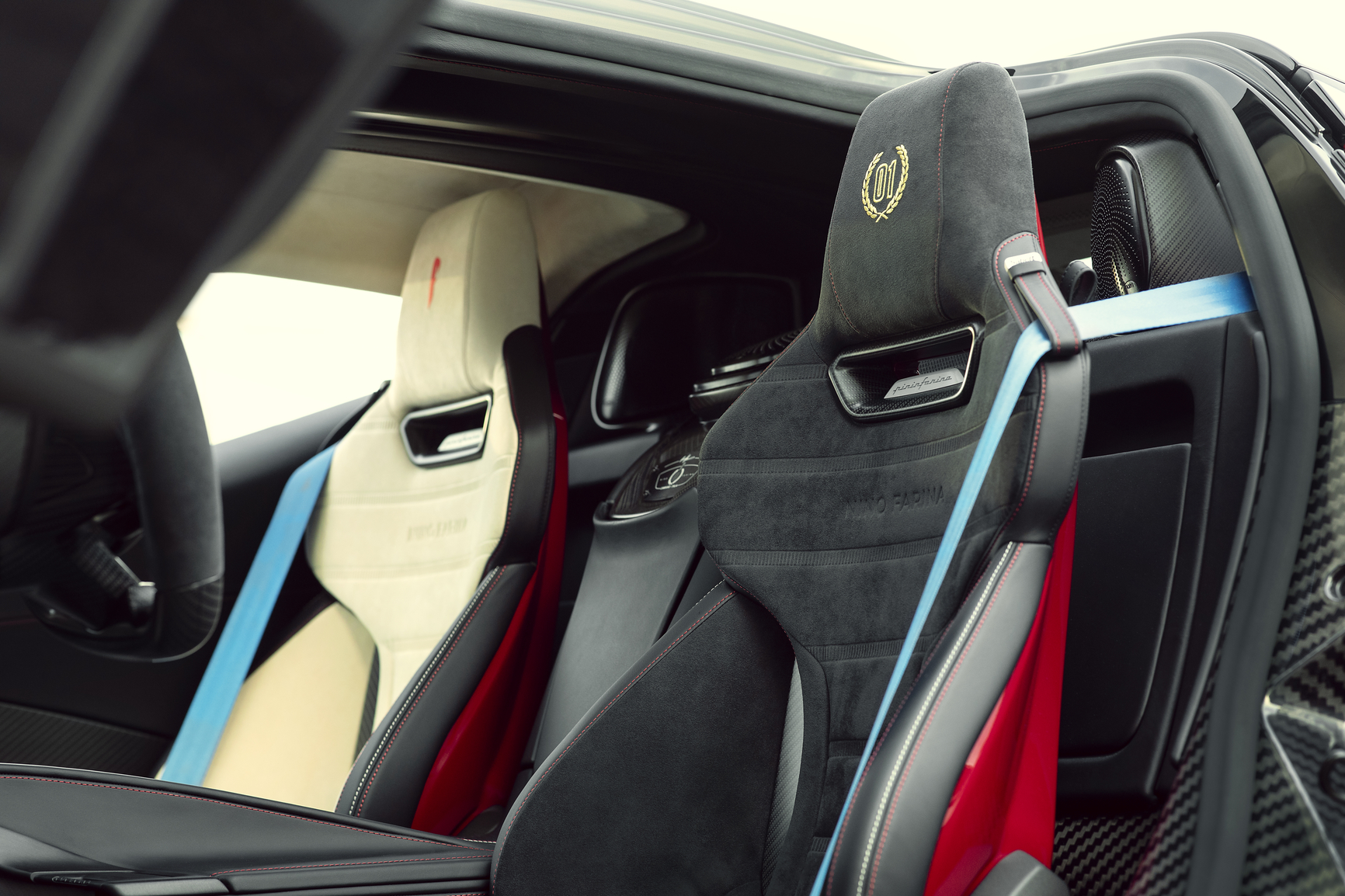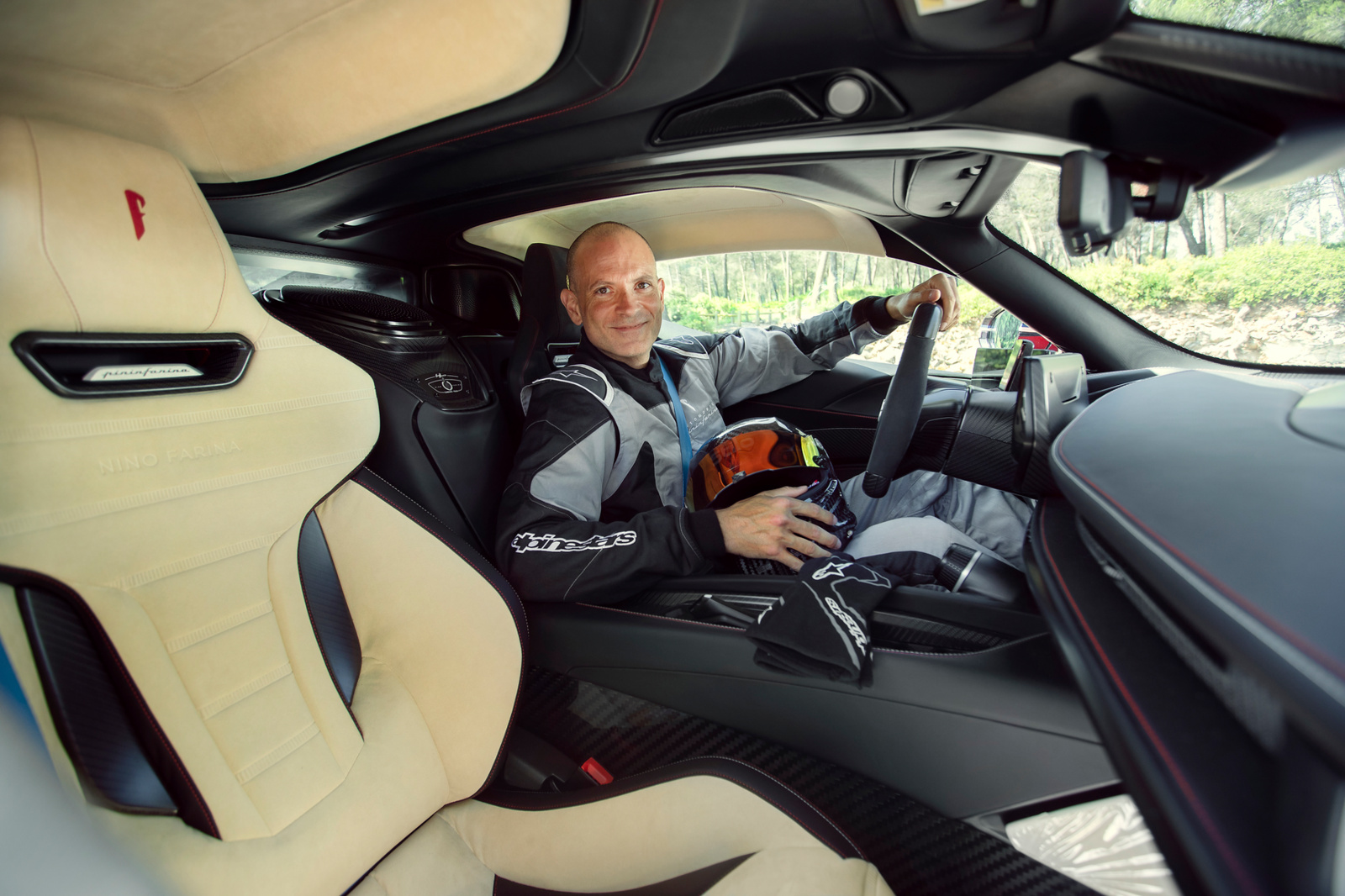 Интерьер гиперкара имеет эксклюзивную двухцветную отделку из бежевой кожи и черной алькантары с надписями Nino Farina. Также водительское и пассажирское кресла получили индивидуальную отделку и вышивки на подголовниках. На двери каждого из пяти экземпляров модели появятся особые алюминиевые таблички.