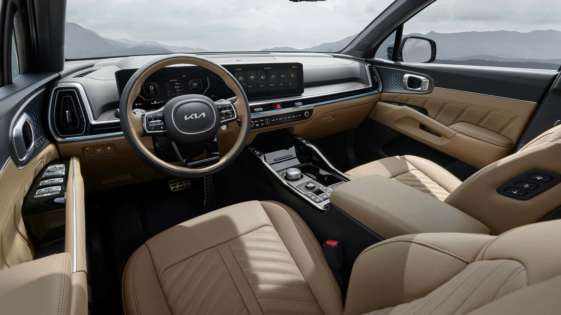 В салоне вместо раздельных экранов перед водителем теперь установлена единая изогнутая панель, объединяющая дисплей цифровой «приборки» и тачскрин мультимедиа диагональю 12,3 дюйма каждый. При этом вертикальных дефлекторов вентиляции больше нет, а блок управления системой климат-контроля сделан как у моделей EV6 и Sportage.
