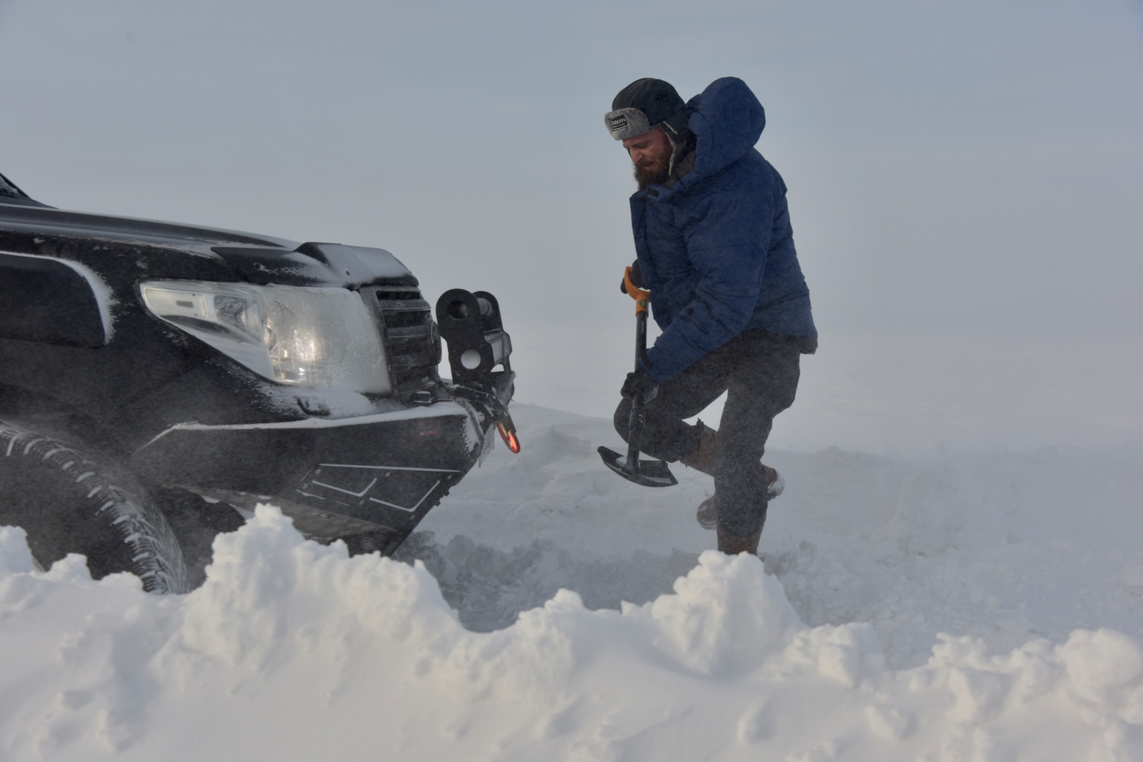 Часто бывает так, что ты просто не можешь ехать. Точнее, ты не можешь двигаться вообще. Метель настолько сильная, что ты просто не видишь ничего. Это сложно объяснить человеку, который никогда не был в тундре. Просто представь: дорог там нет — только промерзшая почва. То есть мы знаем примерно, в каком направлении нам нужно двигаться, и по карте строим маршрут. Стараемся ехать строго прямо, не отклоняясь от курса, но к этому еще добавляется метель. То есть у тебя нет ни дороги, ни следов, зато есть суровые погодные условия. И ты даже не можешь понять, куда ехать.