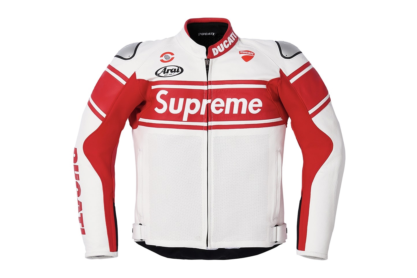 В новую коллекцию вошли гоночный мотокомбинезон и куртка Dainese, сделанные из перфорированной воловьей кожи и получившие подкладку из бактериостатической ткани Nanofeel. На груди, спине, рукавах, воротниках и штанинах нанесены надписи Supreme и Ducati. Сбоку на комбинезоне можно заметить изображение мотоспортсмена на Streetfighter V4 S, заходящего в поворот. Кстати, рисунок был разработан Альдо Друди, который создаёт аэрографии для шлемов Валентино Росси.