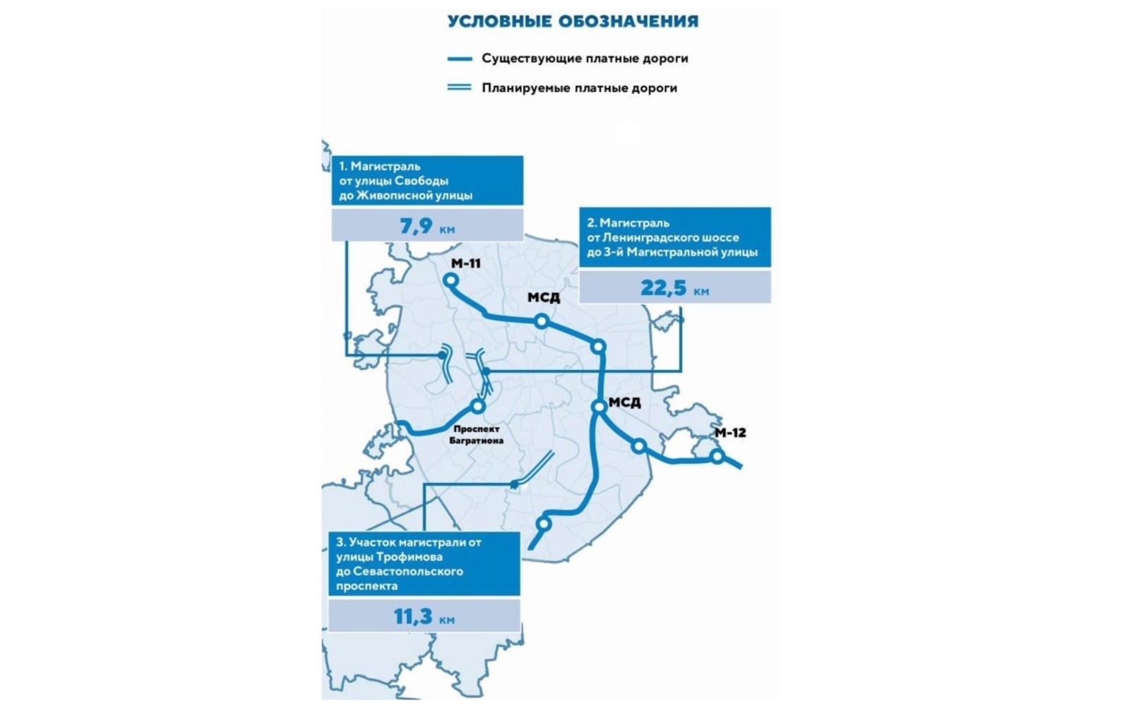 Так, одна трасса пройдёт от Ленинградского шоссе до 3-го Магистрального проезда и соединит север города с деловым центром «Москва-Сити». Ещё одна появится от улицы Свободы до Живописной улицы. Она свяжет Покровское-Стрешнево и застройку бывшего Тушинского аэродрома с Хорошёво-Мнёвниками в обход Волоколамского шоссе. Третья дорога будет пролегать от бывшей промзоны «ЗИЛ» до юга и юго-запада столицы в обход Третьего транспортного кольца.
