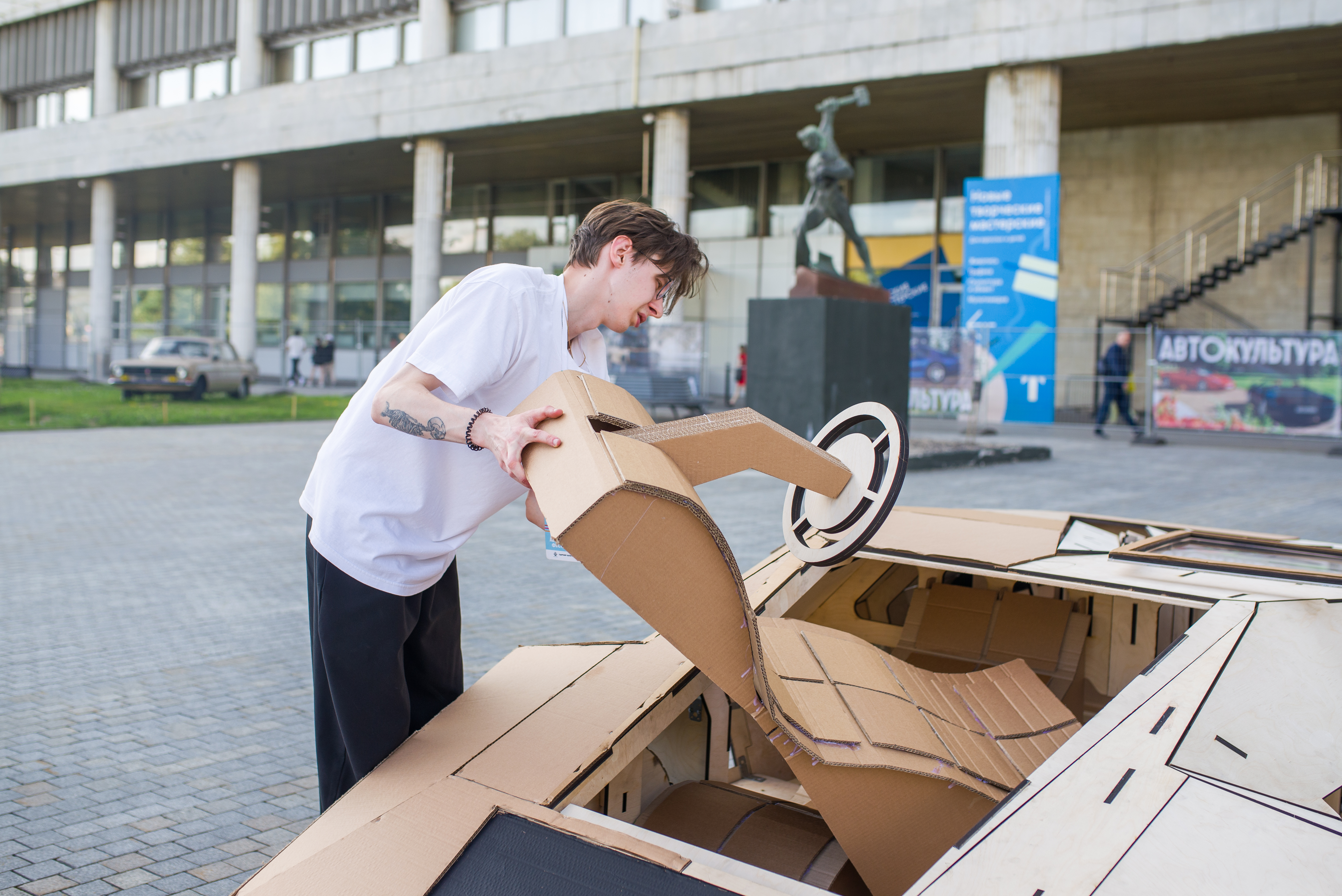 Помимо уже узнаваемых элементов «Автокультуры», в этом году на фестивале представили арт-пространство, которое художники и начинающие дизайнеры смогли превратить в настоящую выставку под открытым небом. В центре внимания оказался арт-объект на набережной «Музеона» в зоне «Капля»: сквозь гигантские очки прохожие могли взглянуть на происходящее вокруг глазами коллекционера, погрузиться в невероятную атмосферу и увидеть уникальный мир редких автомобилей.
