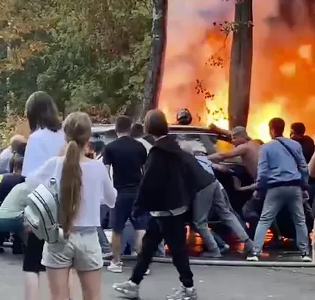 На опубликованных в соцсетях роликах видно, как несколько человек толкают машину, чтобы спасти её от огня. Ещё несколько автомобилей пожарные пытаются потушить брандспойтами.