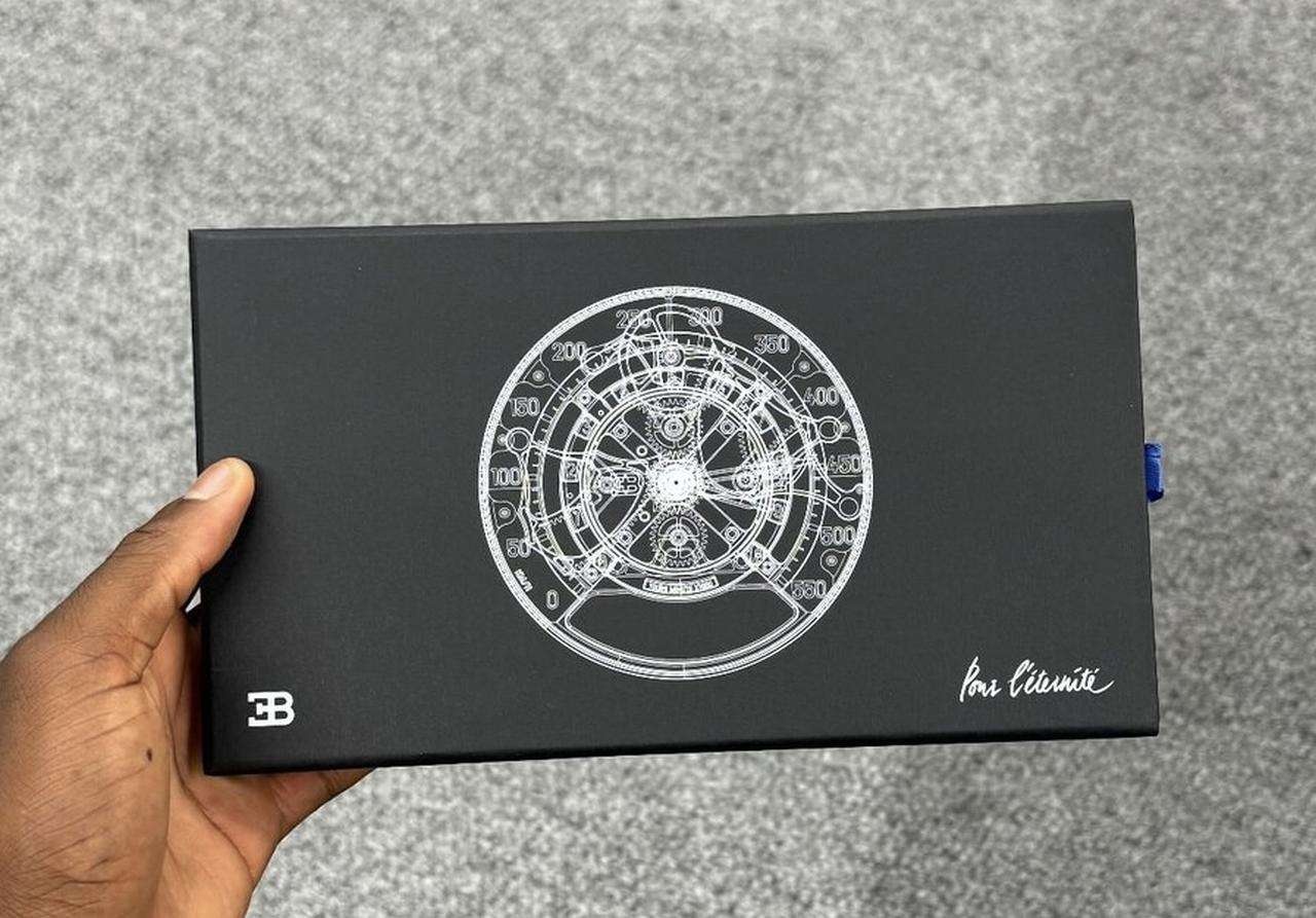 Так, один из известных блогеров Маркес Браунли опубликовал снимок подарочной коробки от Bugatti. Изображение на её крышке на первый взгляд напоминает часовой механизм, однако при детальном рассмотрении становится понятно, что это рисунок спидометра. И максимальная отметка скорости у него составляет 550 километров в час, что на 50 километров в час больше, чем у Chiron.