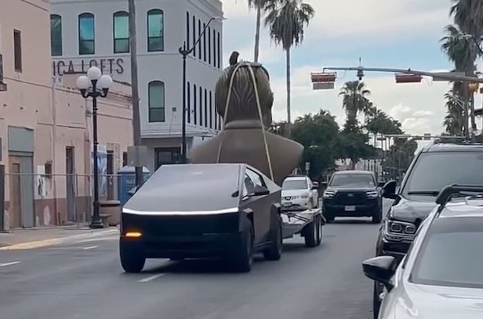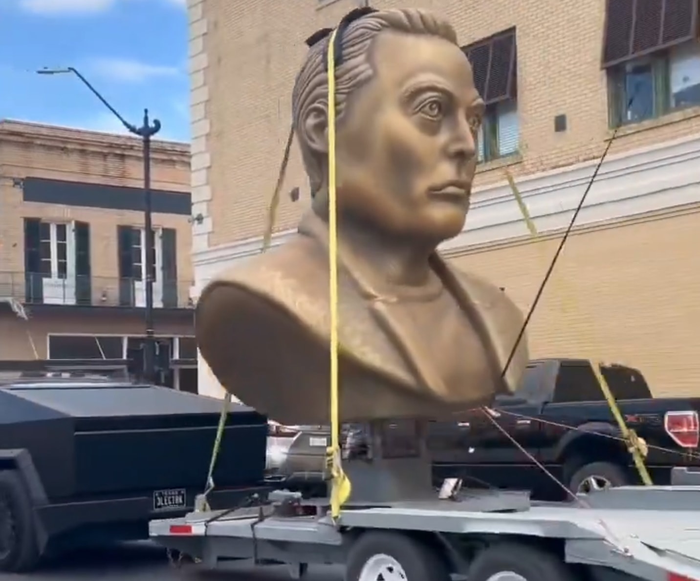 В Техасе замечен Tesla Cybertruck, буксирующий огромный бюст Илона Маска