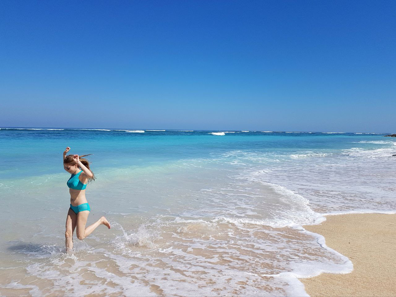 Как мы уже писали, из-за приливов-отливов придётся побегать за водой по разным пляжам. Для разнообразия — почему бы и нет? Расскажем про те, которые запомнились нам. Pandawa Beach — даже не знаем, что тут понравилось больше: нереальное лазурное море и белый песок или ведущая к пляжу живописная дорога, выдолбленная в белых скалах.