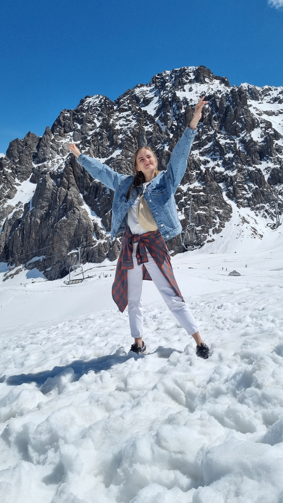Кабинка уносит по канатной дороге вверх и вверх: внизу остаётся огромная парковка, на которой среди машин, превратившихся в точки, так забавно попробовать отыскать свою. А впереди вырастают одна за другой горы: на улице тепло, но вершины уютно укутаны в белоснежный тулупчик. То тут, то там мелькают деревянные шале, кто-то медленно скользит на сноуборде, а вот и станция показалась. Альпы? Нет, Шымбулак (в Казахстане «жи»-«ши» не пиши с «и»)! Находится горнолыжный курорт на высоте 2260 метров над уровнем моря, всего в 20 минутах езды от Алматы. И если зимой все едут сюда, чтобы покататься на классных трассах, общая протяжённость которых — 25 километров, то весной народ здесь просто расслабляется. Детский восторг от того, что ты в шортах шагаешь по вязкому снегу, а вокруг жара, зашкаливает.