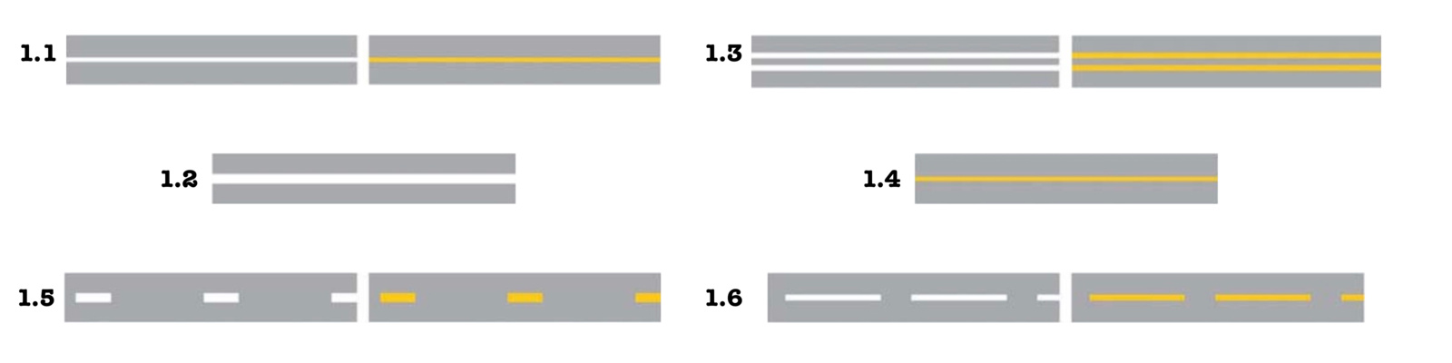 Разметка 1.1 — стандартная сплошная. Её наносят на двухполосных дорогах, отделяя попутное направление от встречного, между рядами (там, где нельзя перестраиваться) и даже на парковочных местах, обозначая их границы.