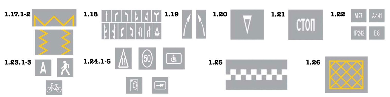 Если обратиться к ПДД, можно найти 26 разных «рисунков». Разберём их все по очереди.