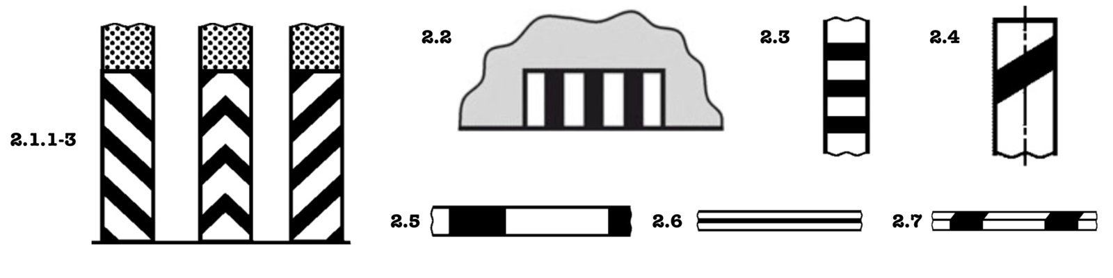 Разметка 2.6 — такая схема окраски более привычна, её используют на ограждениях вдоль участков дорог, которые не стремятся отправить водителя в кювет.